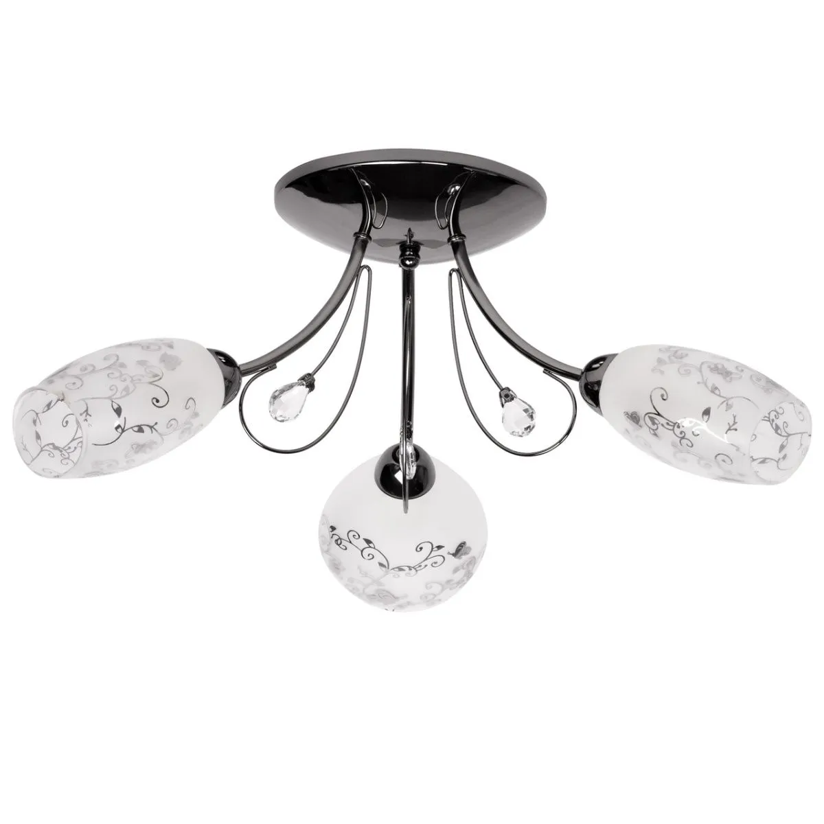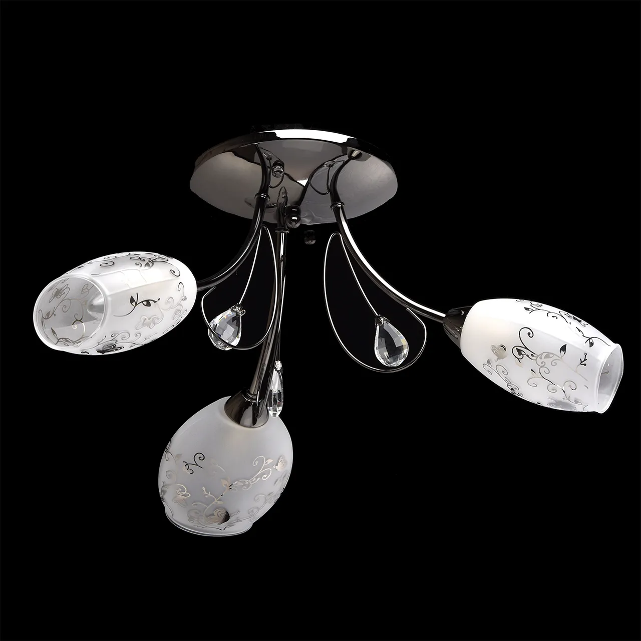 Металлическое основание цвета никеля, плафоны из матового стекла с гальванизированным рисунком, деко